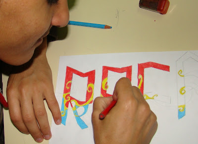 Após isso, os alunos copiaram o seu nome para papel vegetal e decalcaram o mesmo para uma nova folha A3. Procedeu-se de seguida aos estudos de cor com pintura a lápis de cor.